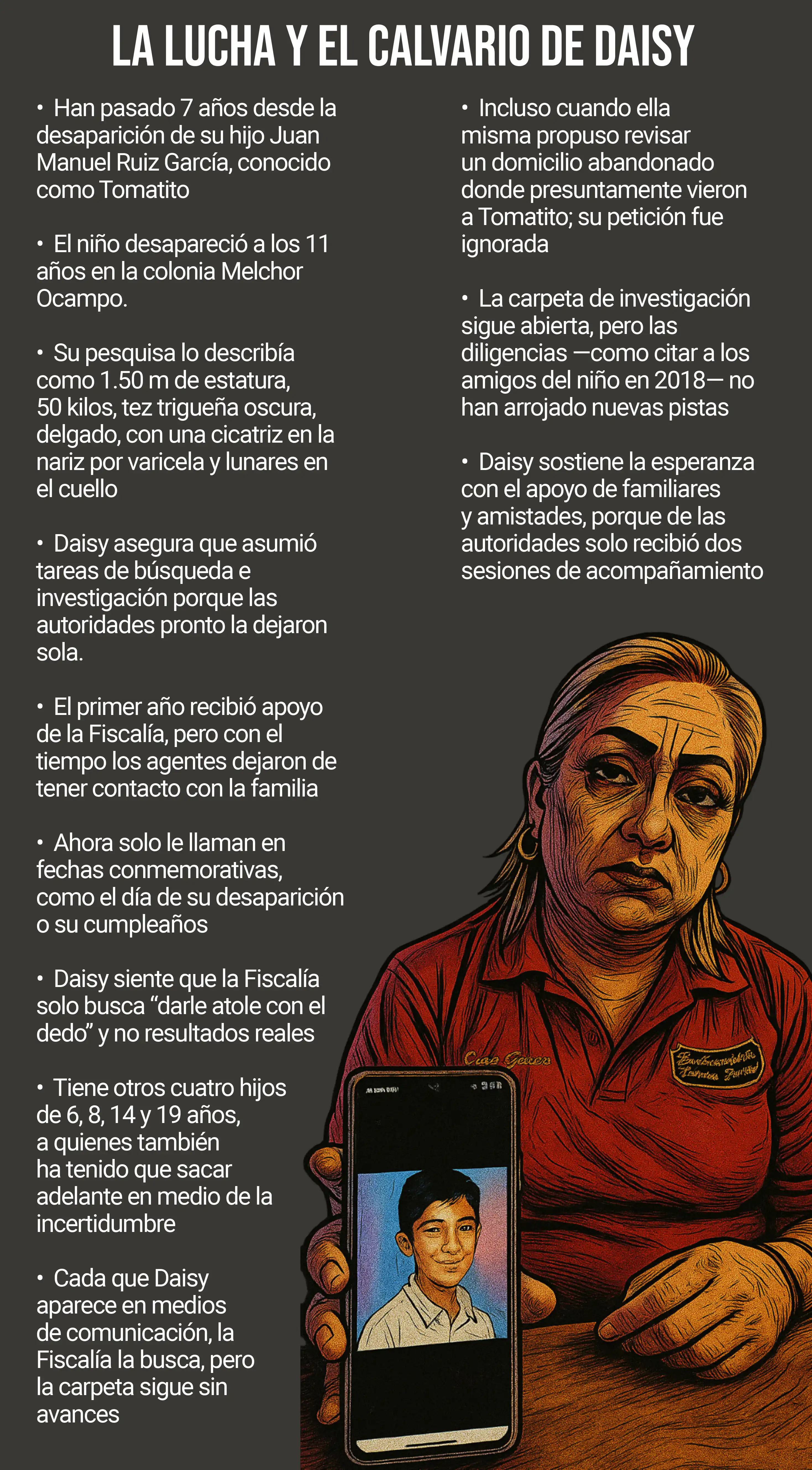 Desde el primer momento de la ausencia de su hijo, Daisy menciona que asumió tareas que deberían realizar las autoridades, tanto de investigación como de búsqueda, porque sentía que la dejaban sola. Después todo fue peor, agrega, porque considera que estas, con el paso del tiempo, perdieron el interés en buscarlo.
