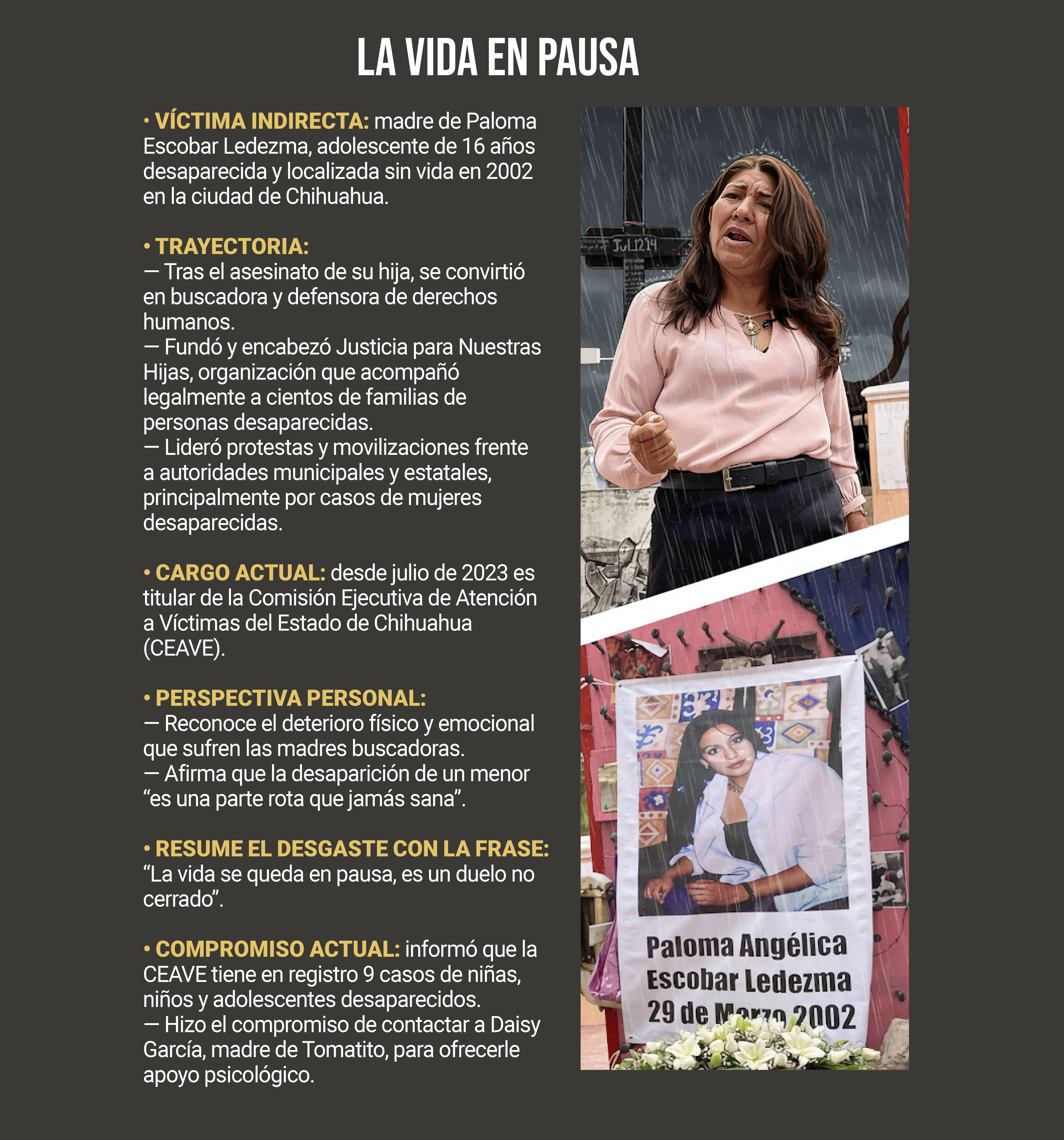 Su hija Paloma Escobar Ledezma, de 16 años, fue desaparecida y días después localizada sin vida en 2002, en la ciudad de Chihuahua.