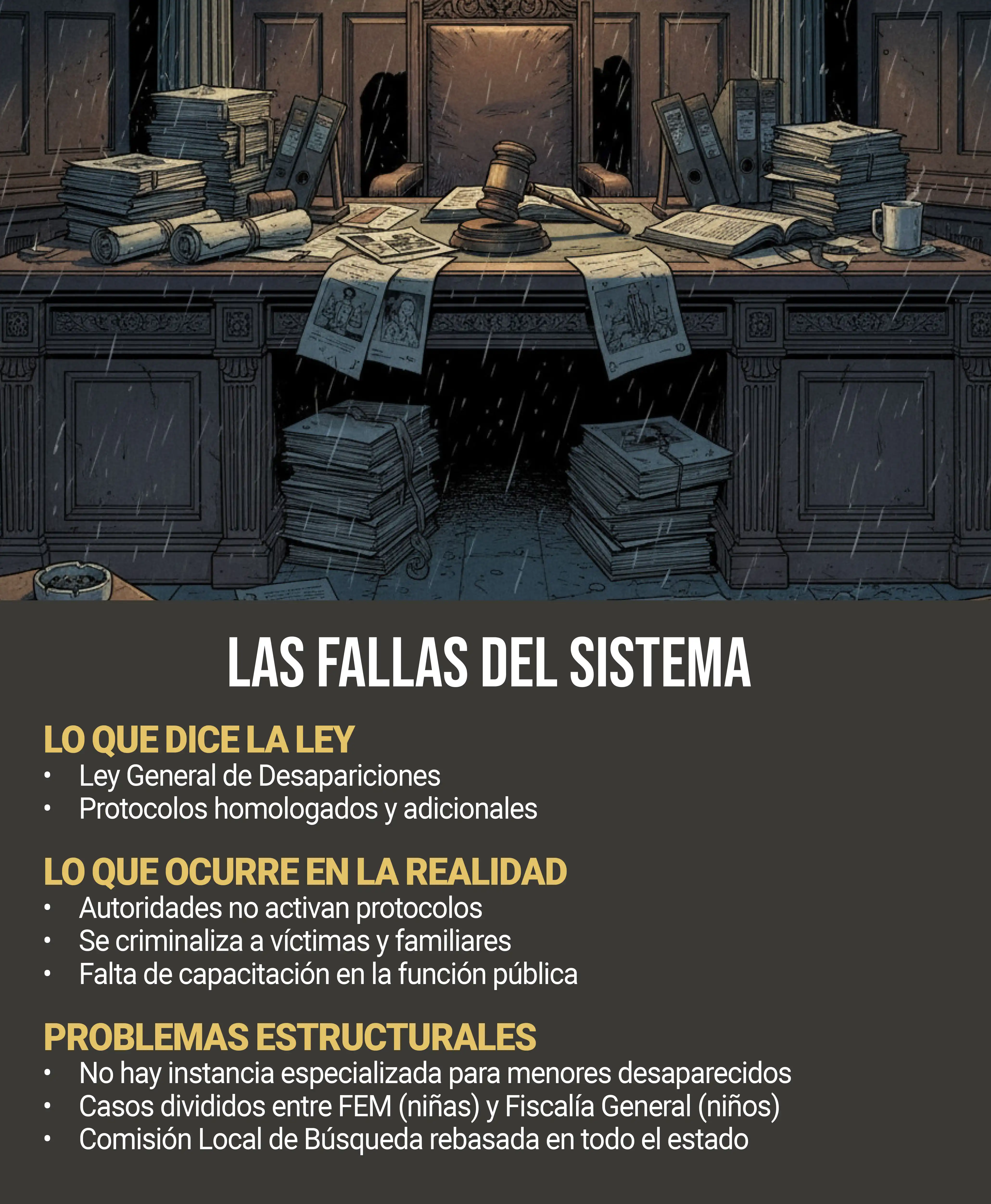 En México existen varias normas enfocadas en la búsqueda de personas, como la Ley General en Materia de Desapariciones, los protocolos homologados de búsqueda, protocolos adicionales de búsqueda, entre otros, que, de acuerdo con organizaciones acompañantes de familias de víctimas, se quedan cortos ante la falta de políticas públicas para atender las causas de violencia que sufren las infancias y que, en muchos casos, derivan en su desaparición.