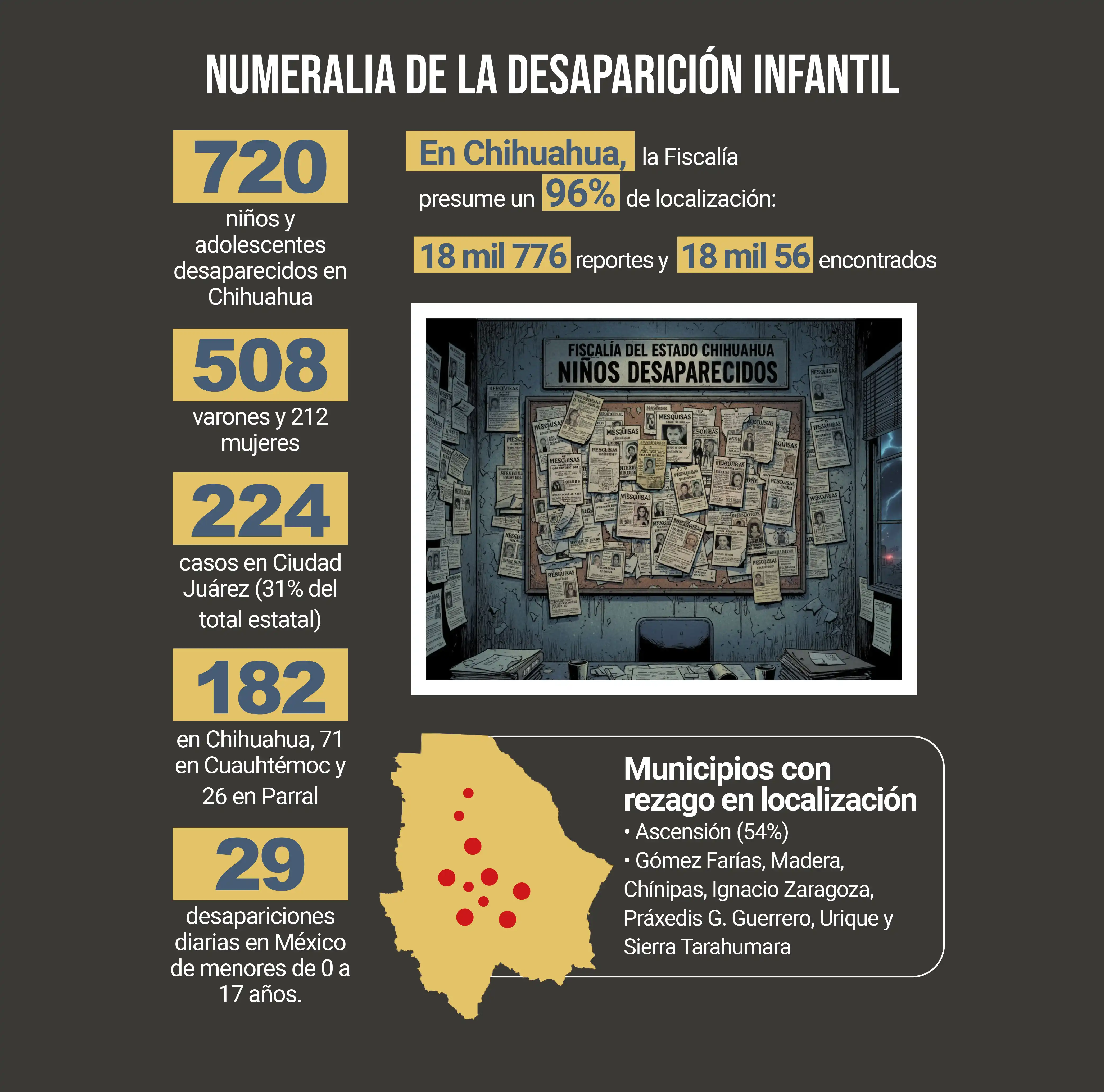 Ciudad Juárez encabeza la lista de municipios en el estado con más niños y adolescentes ausentes: 224 casos, es decir, el 31 por ciento del total de infantes reportados como desaparecidos no localizados en la entidad; Chihuahua ocupa el segundo lugar, con 182; después aparecen Cuauhtémoc con 71 y Parral con 26