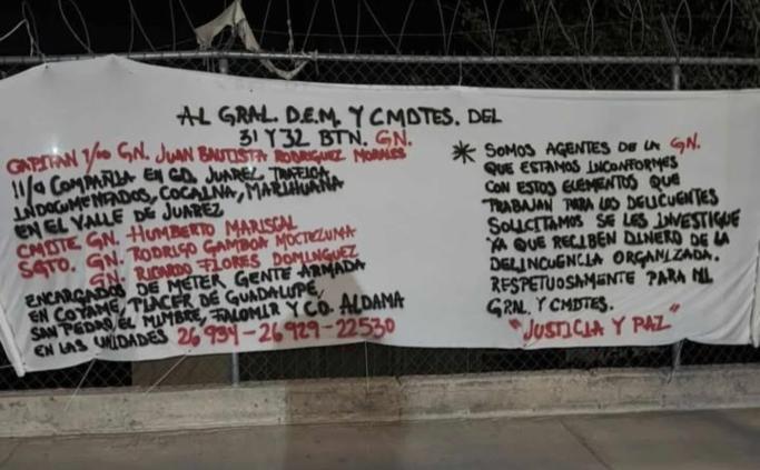 “Somos agentes de la GN que estamos inconformes con estos elementos que trabajan para los delincuentes. Solicitamos que se les investigue, ya que reciben dinero de la delincuencia organizada. Respetuosamente para mi gral. y cmdtes. Justicia y Paz”, firman los responsables.