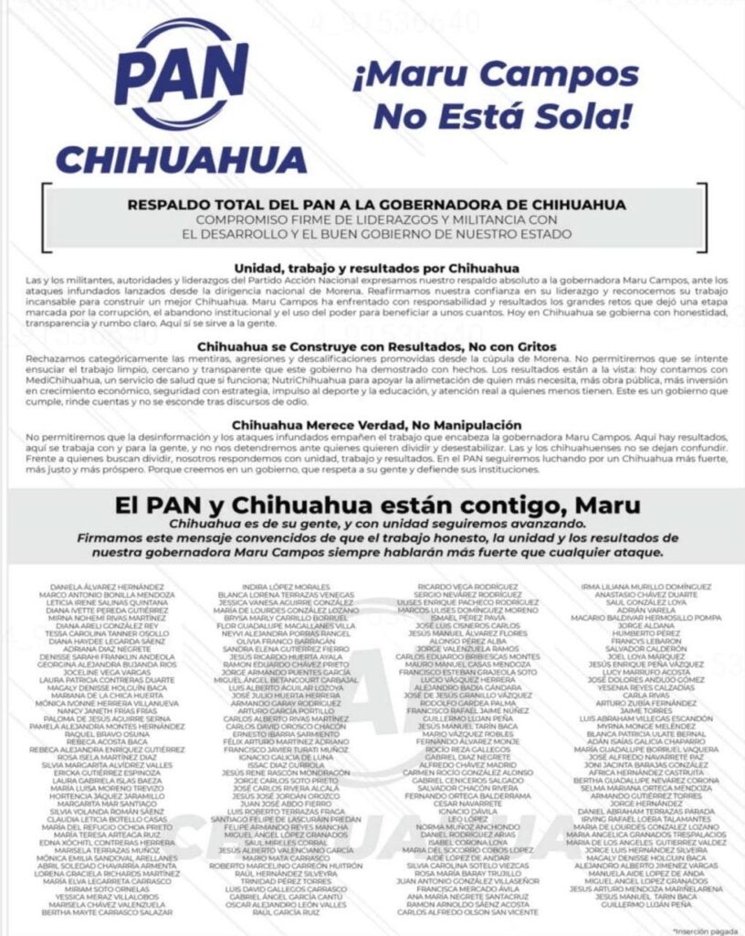 El caso es que mandaron publicar desplegado de apoyo en favor de la mandataria de Chihuahua, sin que faltaran las firmas ninguno de los cuadros y figuras blanquiazules.