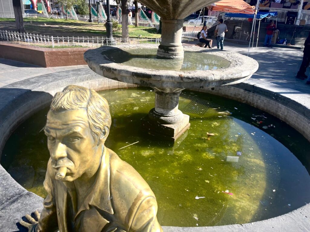 Ni una foto a gusto se puede tomar alguien junto a la emblemática figura de Tin Tan, sentado en la fuente de la Plaza de Armas. Literalmente, la fuente está llena de agua puerca y de basura. Hasta parecen las aguas negras que todavía ruedan por la Acequia Madre. Igual de pestilentes y ni quién limpie la fuente y la ponga en funcionamiento.