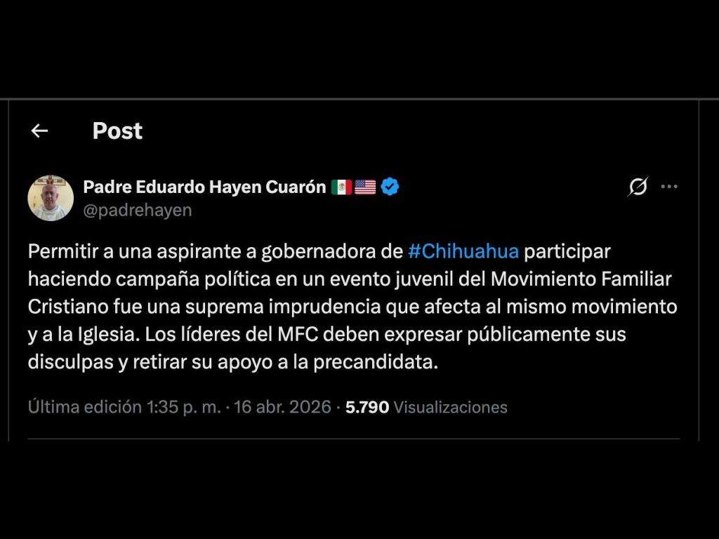 “Permitir a una aspirante a gobernadora de #Chihuahua participar haciendo campaña política en un evento juvenil del Movimiento Familiar Cristiano fue una suprema imprudencia que afecta al mismo movimiento y a la Iglesia. Los líderes del MFC deben expresar públicamente sus disculpas y retirar su apoyo a la precandidata”, escribió el padre.