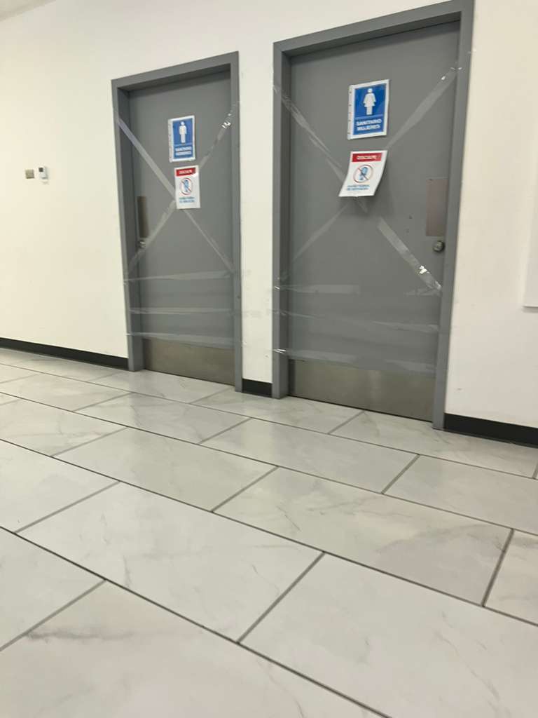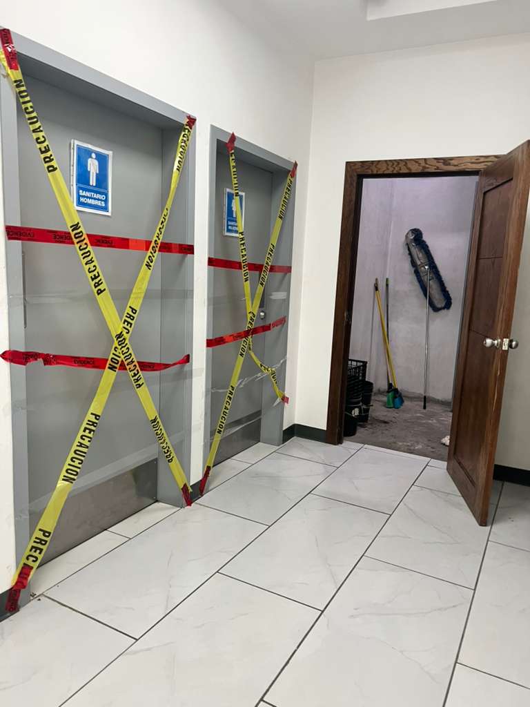 Ahí se pueden ver las puertas bloqueadas de los sanitarios y las cintas rojas y amarillas impidiendo el paso, en los distintos niveles. También está la evidencia fotográfica.