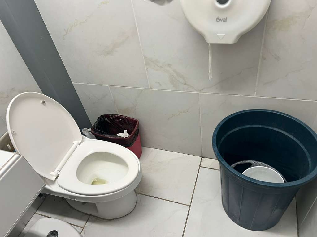 La única taza de baño ubicada en la planta baja funciona con la cubeta y el personal de intendencia trae esa dura tarea del acarreo. Ya hasta les duele la espalda. Las mujeres empleadas y funcionarias prefieren, si es que pueden, aguantarse o ni siquiera tomar agua, para no ir a hacer fila afuera del baño.