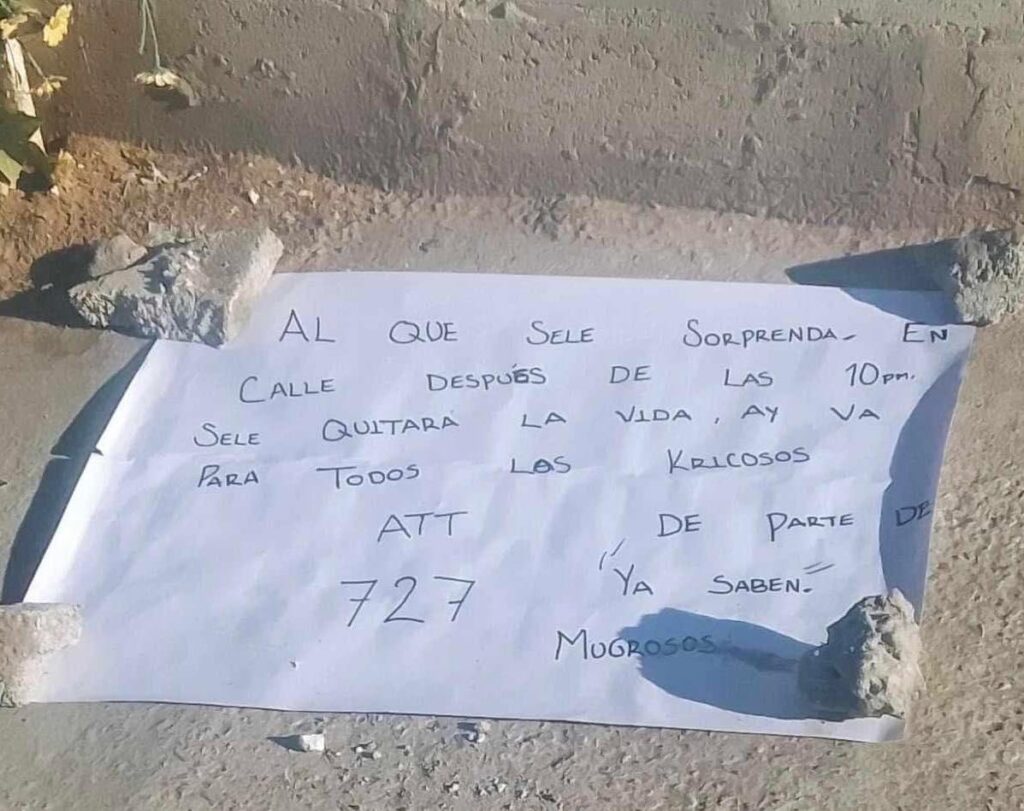 “Al que se le sorprenda en calle después de las 10:00 p.m. se le quitará la vida. Hay va para todos los kricosos de parte de 727. Ya saben, mugrosos” se escribió en tinta color negro sobre una cartulina blanca.