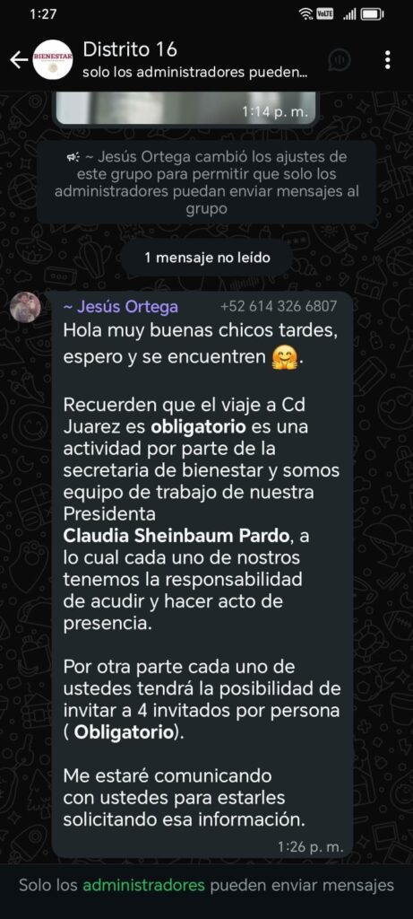 Y por si quedaba duda, otro de Jesús Ortega, también asistente de Rascón: “Recuerden que el viaje a Cd. Juárez es obligatorio, es una actividad por parte de la Secretaría de Bienestar y somos equipo de trabajo de nuestra presidenta Claudia Sheinbaum Pardo, a lo cual cada uno de nosotros tenemos la responsabilidad de acudir y hacer acto de presencia”.