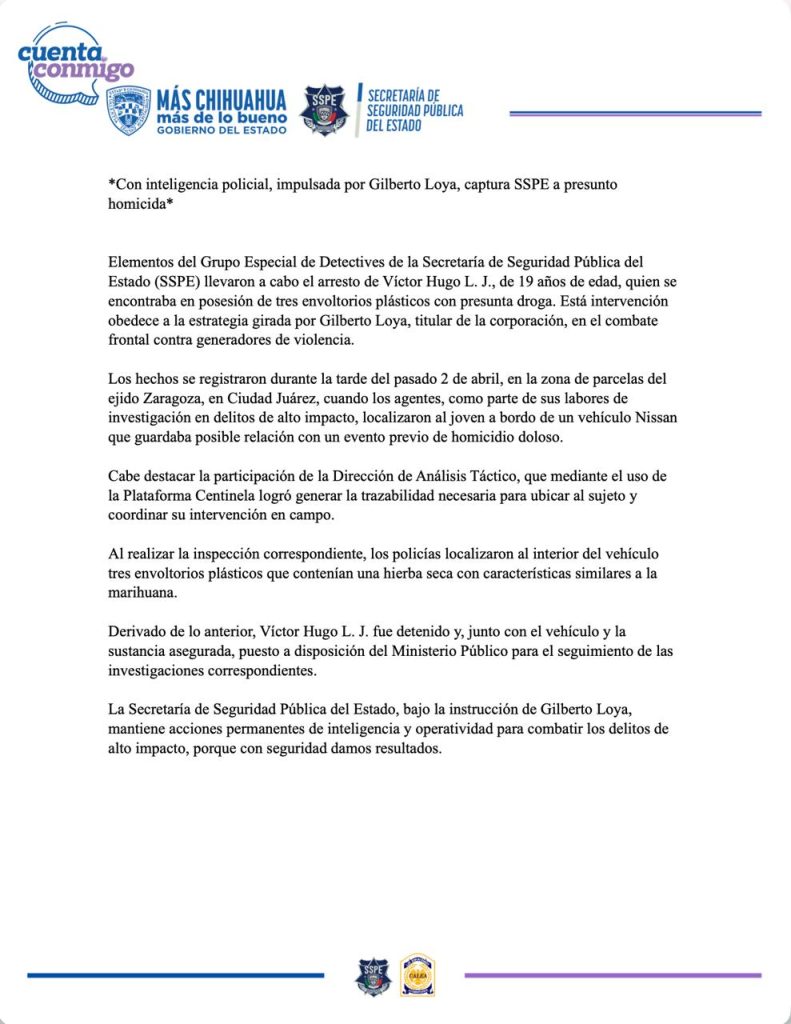 Pero no. Otra más: “Con inteligencia policial, impulsada por Gilberto Loya, captura SSPE a presunto homicida”.