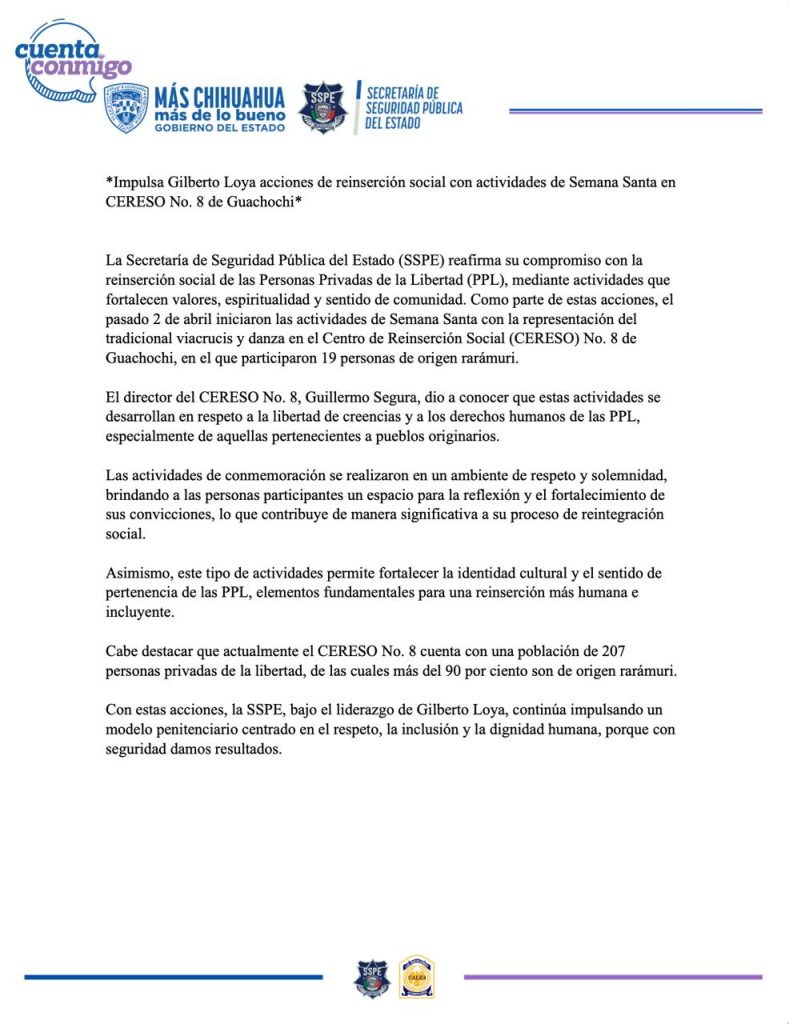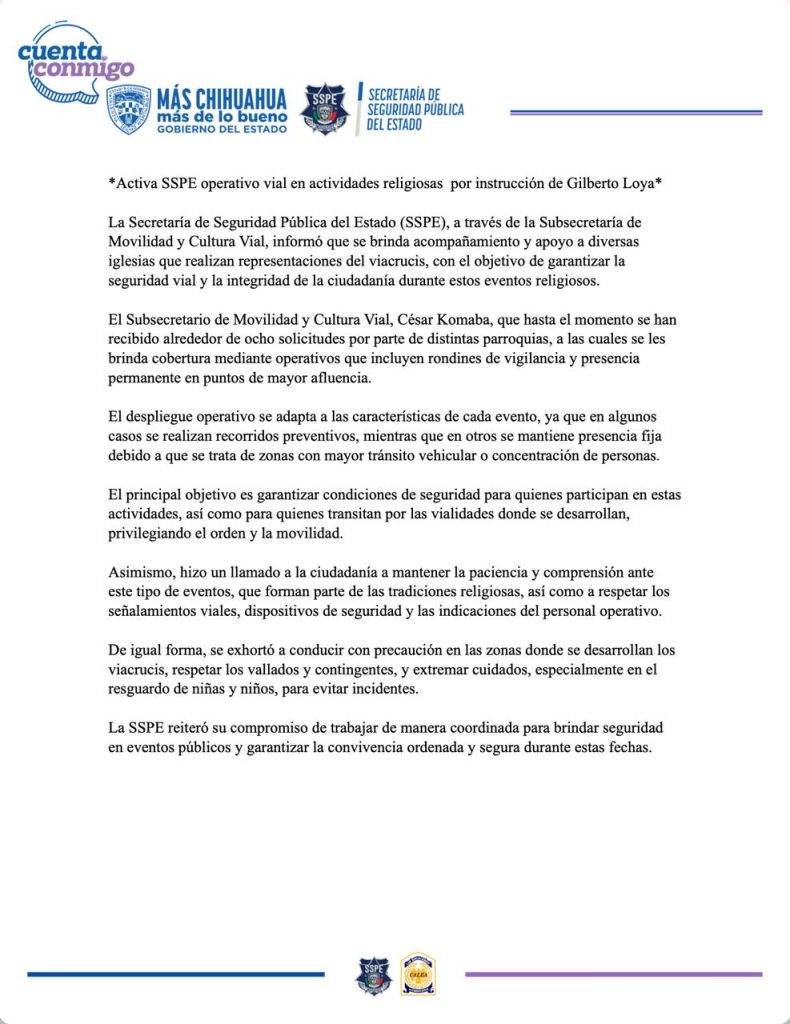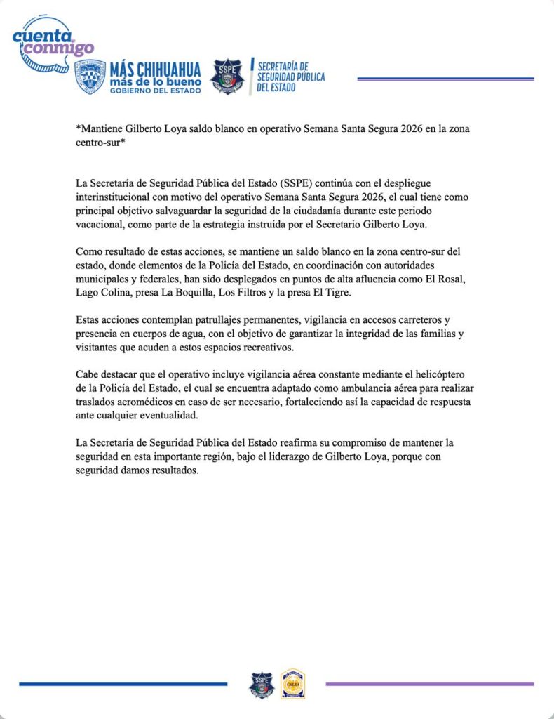 Para muestra, aquí va no un botón, sino la camisa completa. Comunicado del viernes 3 de abril: “Mantiene Gilberto Loya saldo blanco en operativo Semana Santa Segura 2026 en la zona centro-sur”.