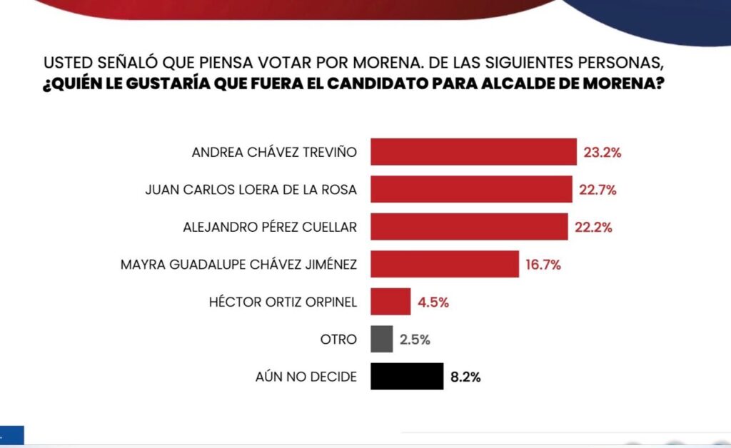 Se supone que la senadora Andrea Chávez va por la gubernatura, pero aquí la incluyeron en las preferencias morenistas por la alcaldía de Juárez. En este febrero apareció la legisladora con 23.2 por ciento de las preferencias, prácticamente en empate técnico con el también senador Juan Carlos Loera y el diputado federal Alejandro Pérez Cuéllar.