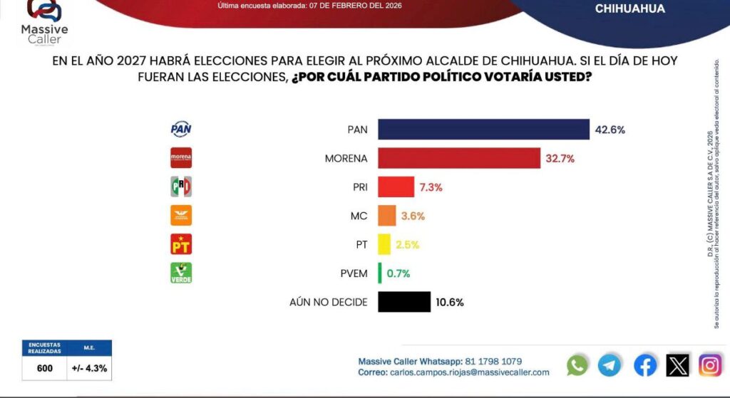 En el caso del municipio de Chihuahua, la más reciente medición de Massive Caller le dio al PAN y a sus aspirantes a la alcaldía unos resultados de intención de voto entre los habitantes de la capital del estado que deben haber sonado a música para sus oídos.