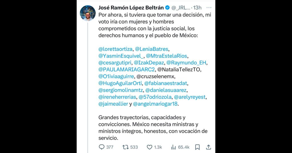 “Grandes trayectorias, capacidades y convicciones. México necesita ministras y ministros íntegros, honestos, con vocación de servicio”, agregó José Ramón, quien tampoco tiene una conexión política directa con la derechohumanista juarense, la 01 en la boleta federal de color morado.