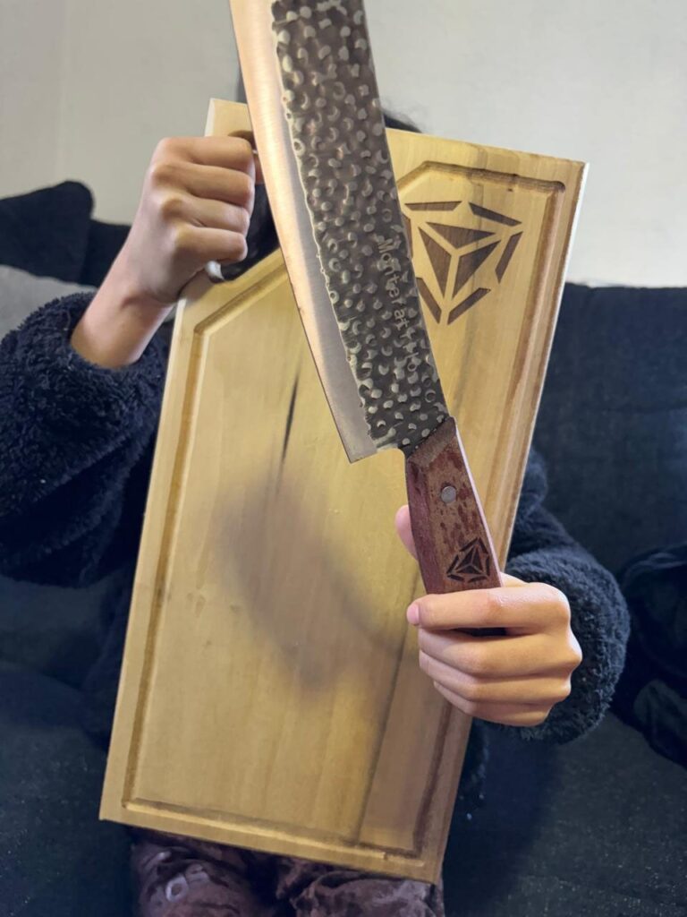 La tabla, robusta, con la insignia oficial de la SSPE grabada al frente, no parece tabla: parece escudo. El cuchillo, largo, pesado, con hoja martillada y funda negra, no parece cuchillo: parece espada. Un combo que no remite a la cocina, sino al campo de batalla. Más Ertugrul que utensilio doméstico.