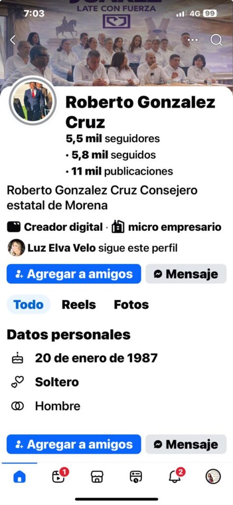 Respecto a Roberto González Cruz, Mirone encontró otro dato interesante: en sus propias redes sociales se ostenta como consejero estatal de Morena, lo que vuelve todavía más difusa esa etiqueta de “movimiento ciudadano” que acompaña al nuevo proyecto.