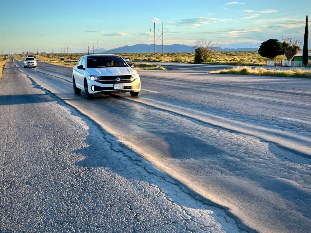Por cierto, ni siquiera la zona de la carretera ya cercana a la mancha urbana juarense se salva. Llegando a la vieja garita aduanal, el pavimento está completamente hundido, formando canalones en donde se marca la rodada de los vehículos. Vaya manera de dar la bienvenida a quien visita a Juárez por carretera.