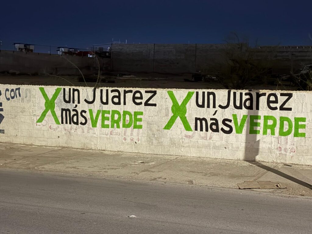 “Por un Juárez más Verde”, señalan las pintas que aparecieron más recientemente, con letras en negro y verde, jugando con el emblema juarense de la X.