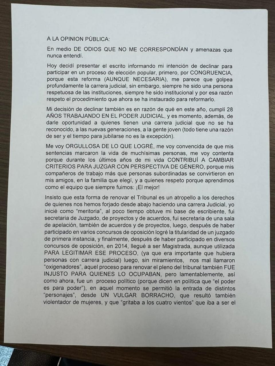 “Esta declinación –escribió– no implica la aceptación tácita de la constitucionalidad de la reforma judicial, así como tampoco mi conformidad con la separación del cargo para el que fui designada hasta el 15 de noviembre de 2029, reservando mis derechos para hacerlos valer ante las autoridades competentes”.