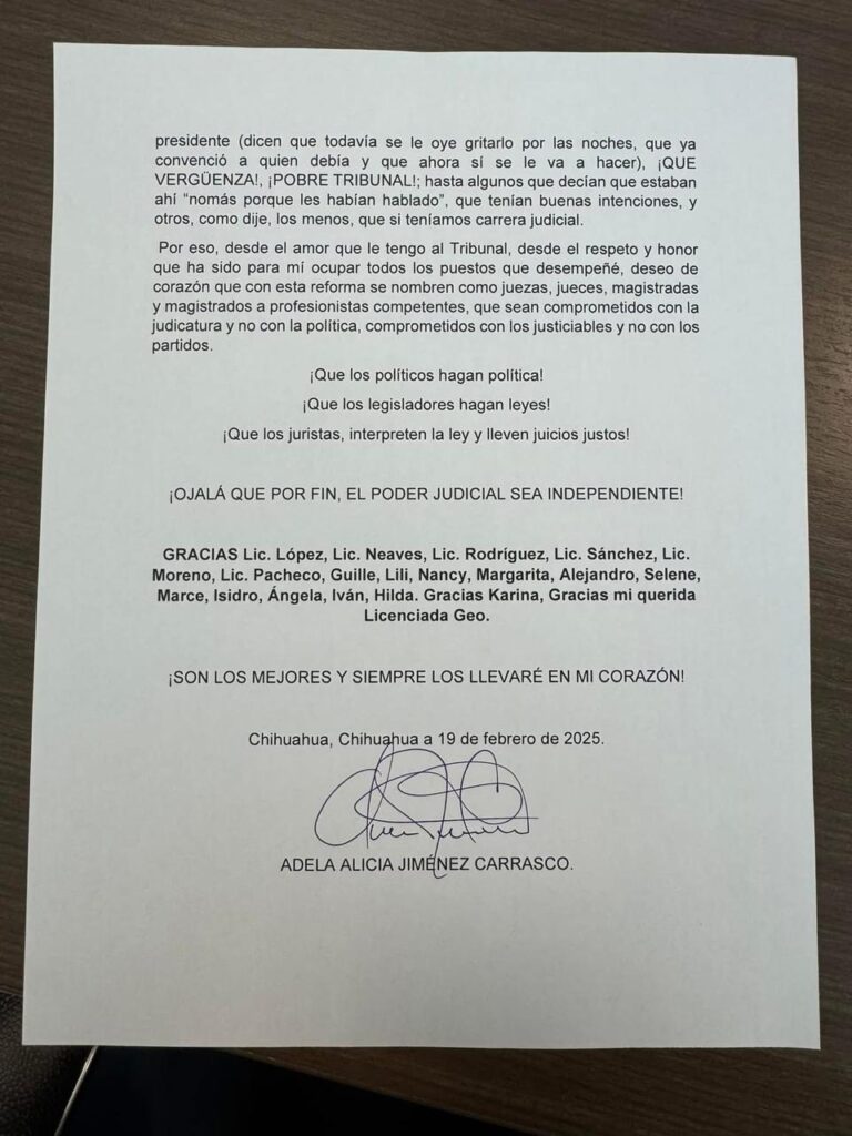 Hasta posicionamiento público fijó, por ejemplo, la magistrada Adela Jiménez Carrasco, siempre crítica al interior del Poder Judicial, de alguna forma disidente del actual grupo en el poder. También fue crítica de la reforma y así dejó constancia en el oficio de declinación entregado al Consejo de la Judicatura del Poder Judicial del Estado.