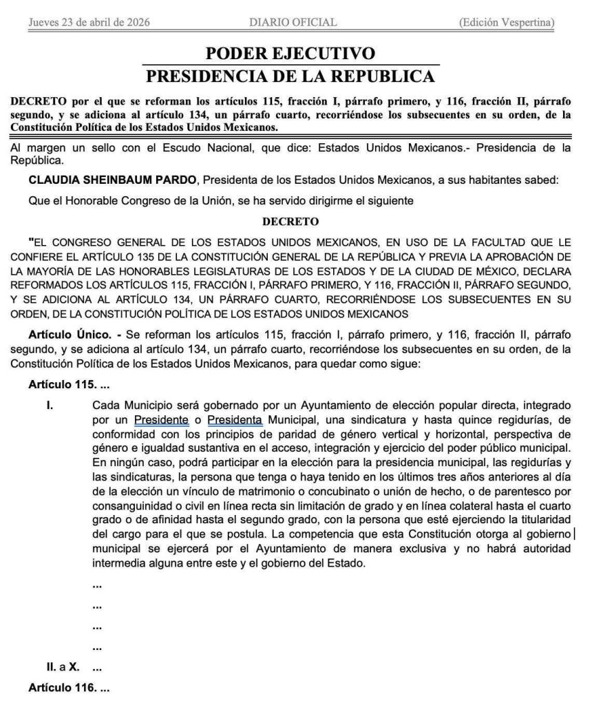 Pero la publicación en el DOF trae otro elemento clave: la prohibición de heredar cargos a familiares no solo aplicará para alcaldías, sino también para regidurías y sindicaturas.
