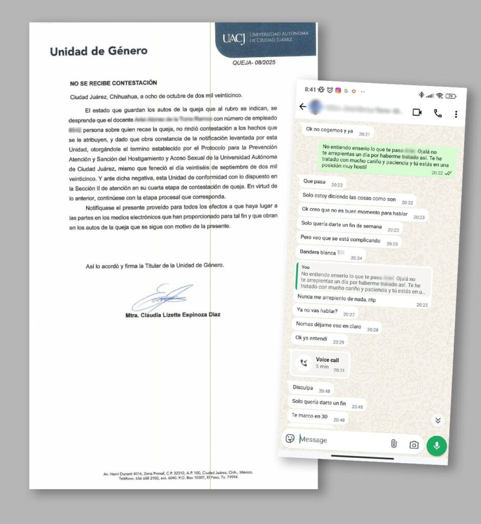 En la amplia comunidad de la Universidad Autónoma de Ciudad Juárez (UACJ), el tema de la semana —con el reinicio de clases— es un caso de presunta agresión sexual (violación) y hostigamiento que involucra a un profesor del Instituto de Arquitectura, Diseño y Arte (IADA).