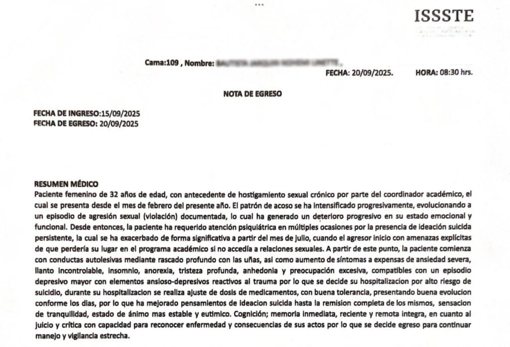 En esa supuesta nota de egreso del ISSSTE se menciona “ideación suicida persistente, la cual se ha exacerbado de forma significativa a partir del mes de julio de 2025, cuando el agresor inició con amenazas explícitas de que perdería su lugar en el programa académico si no accedía a relaciones sexuales”.