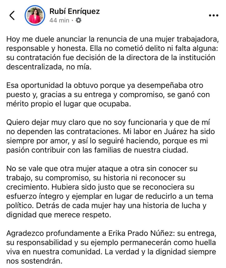 El mensaje de Rubí Enríquez en redes sociales no fue una despedida institucional. Fue un deslinde político en plena confrontación.