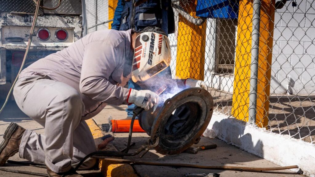 Trabajadores de la Junta Municipal de Agua y Saneamiento (JMAS) de Juárez reparan el Rebombeo de Aguas Negras (RAN) número 24, ubicado en la colonia Jardines del Aeropuerto, después de que se registró una fuga de aguas residuales a consecuencia de una fisura en la infraestructura del sistema.