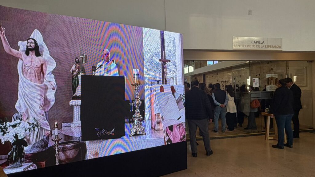 La esposa del exgobernador, Hortensia Olivas de Barrio, acompañada de sus hijas, encabezó la misa celebrada en honor de Francisco Barrio Terrazas en la capilla principal de Mausoleos Luz Eterna.