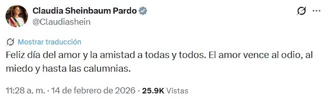 La presidenta Claudia Sheinbaum envió este 14 de febrero un mensaje con motivo del Día del Amor y la Amistad, en el que aseguró que “el amor vence al odio, al miedo y a las calumnias”.