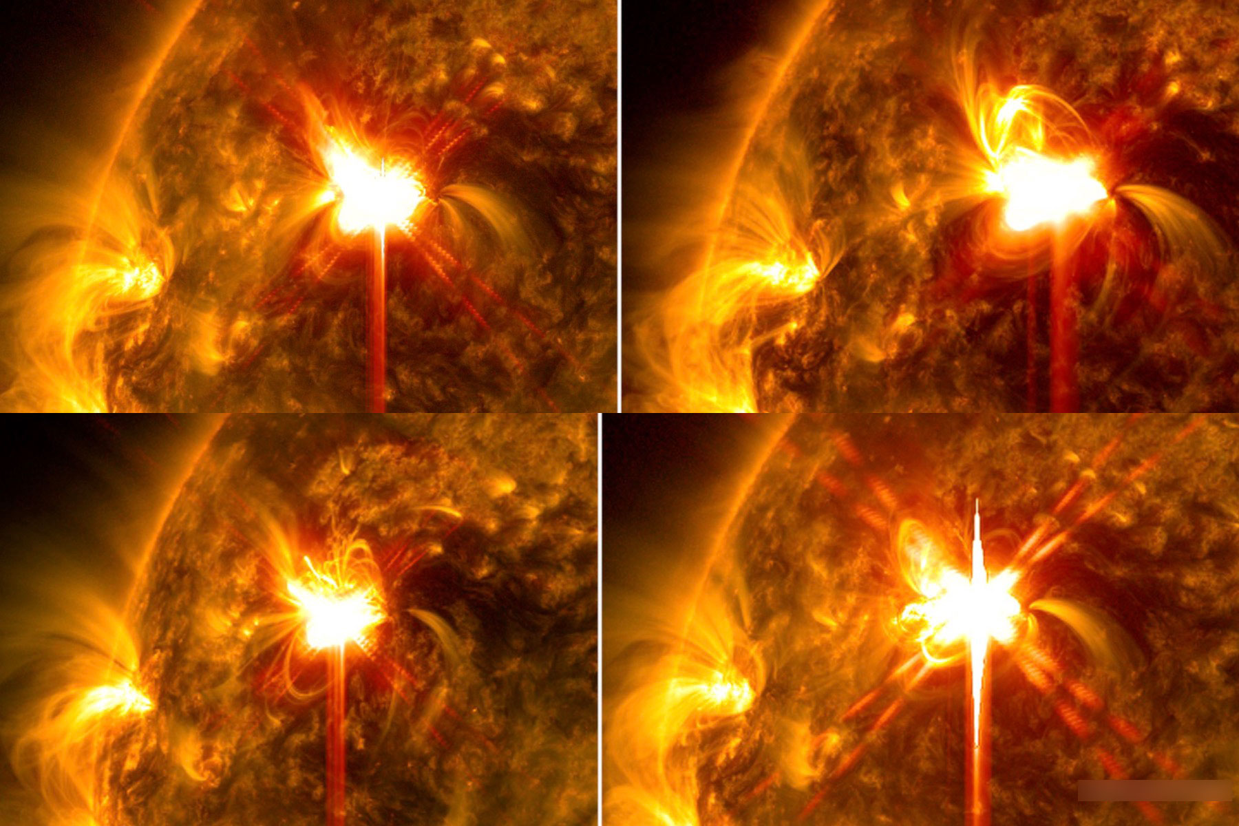 Estas explosiones fueron capturadas por el Observatorio de Dinámica Solar (SDO) de la NASA, que muestra en imágenes de luz ultravioleta extrema el material extremadamente caliente expulsado, en tonos dorados y rojos brillantes.