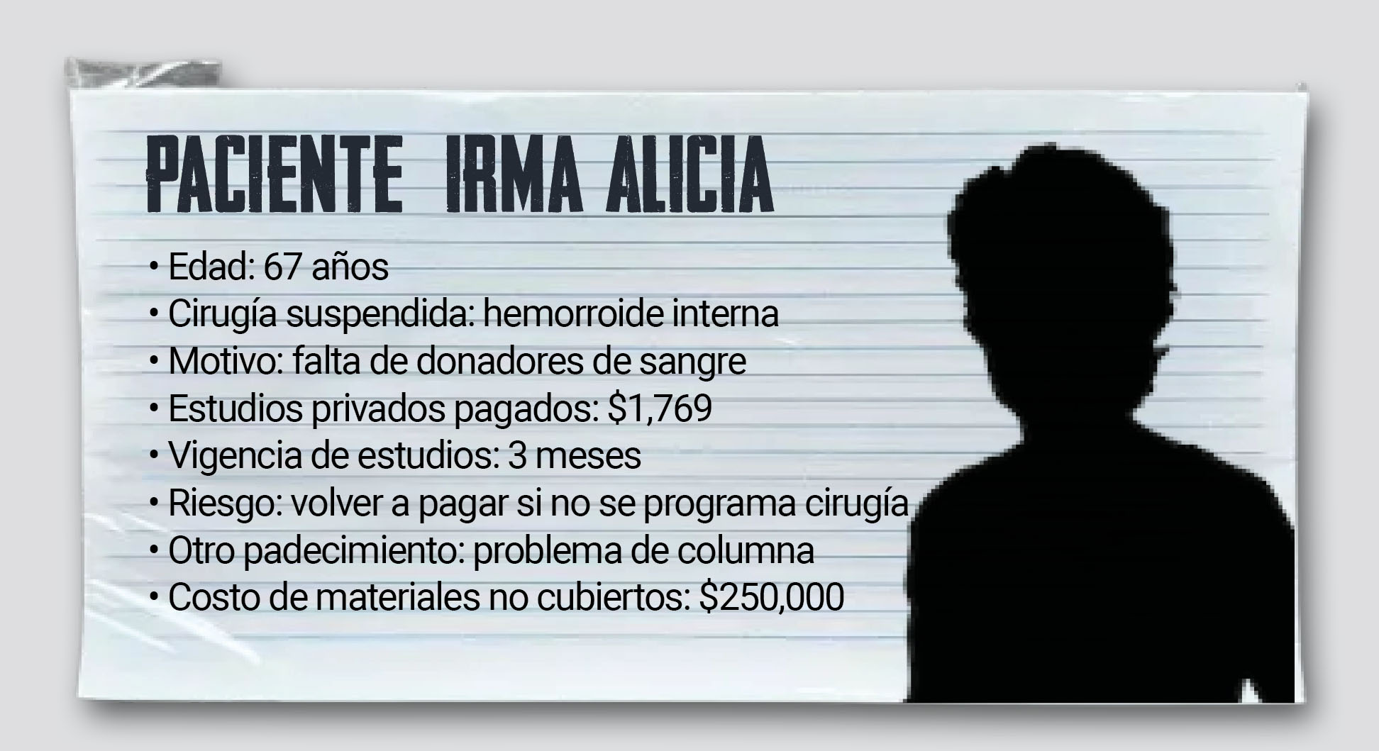 El caso de Irma Alicia también es delicado. Este martes sería operada de una hemorroide interna, pero la cirugía fue suspendida por no contar con donadores de sangre.