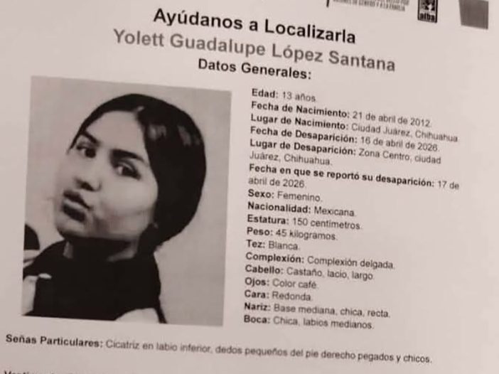Autoridades y familiares solicitaron el apoyo de la ciudadanía para localizar a Yolett Guadalupe López Santana, una adolescente de 13 años de edad que fue vista por última ocasión en el exterior de la institución educativa localizada en el cruce de la avenida Vicente Guerrero y calle Ramón Corona, de la colonia Zona Centro.