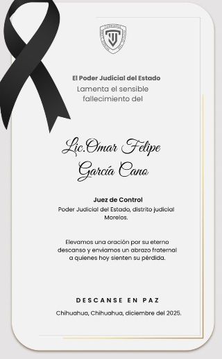 “El Poder Judicial del Estado de Chihuahua lamenta profundamente el sensible fallecimiento de nuestro compañero, el juez de control Omar Felipe García Cano, adscrito al Distrito Judicial Morelos.