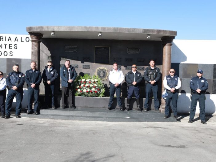 Como es tradición, sus compañeros les rinden honores en el altar a los caídos que se ubica en el patio de la corporación, en el cruce de los bulevares Teófilo Borunda y Óscar Flores.