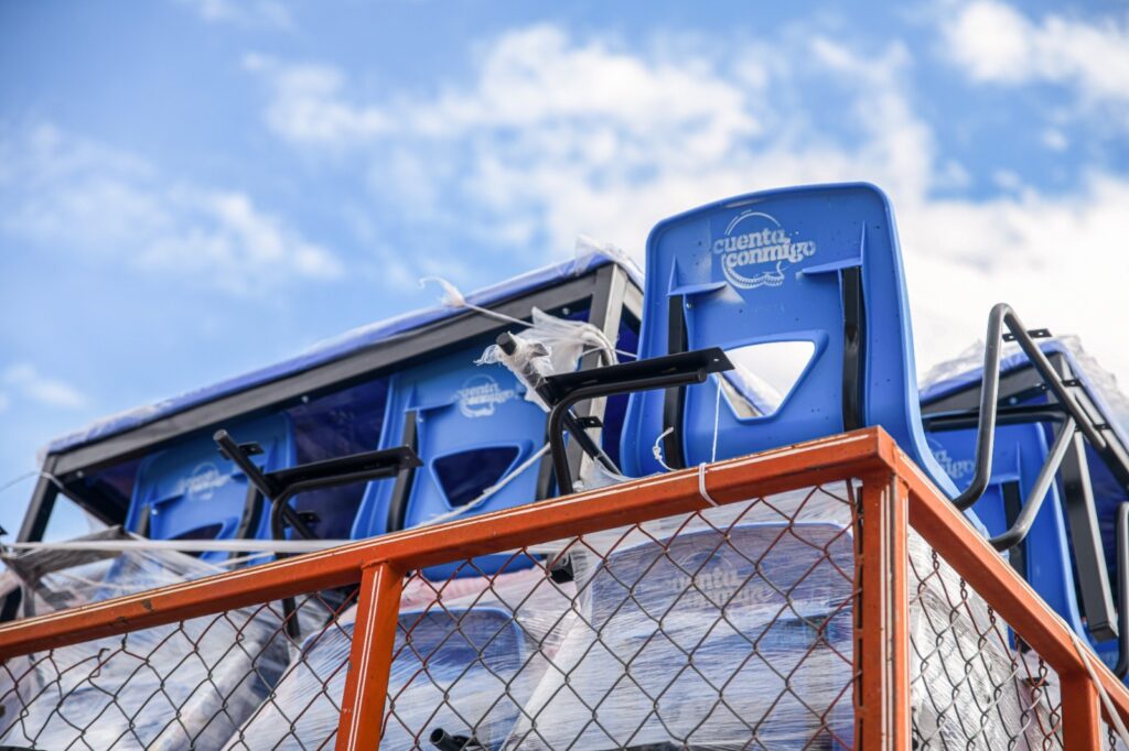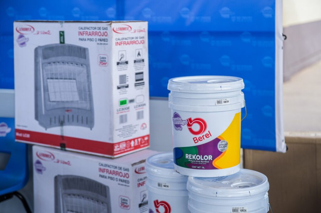 El material distribuido incluye calentones de leña y a gas, aparatos de aire evaporativo, luminarias, pupitres, mesas, sillas, pizarrones, tinacos, además de cubetas de pintura e impermeabilizante, en beneficio de 19 mil 700 alumnos de 36 planteles de la zona, refiere el comunicado.