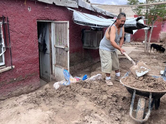 Antes de llegar al cruce del bulevar Bernardo Norzagaray, entre las calles Ombú y Ocotillo, Javier Carrillo, esposo de Twyla Rodríguez, seguía sacando el lodo endurecido que se metió a su patio la tarde noche del pasado jueves 26 de junio.