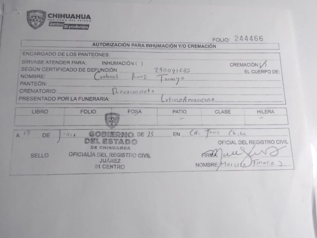Lo más extraño es que de acuerdo con el documento que les entregaron de la funeraria, esta tenía un sello de autorización de parte del Gobierno del Estado, donde la funeraria Latino Americana tenía un permiso para cremar el cuerpo de Don Gabriel, pero en el crematorio Renacimiento, no en Plenitud.
