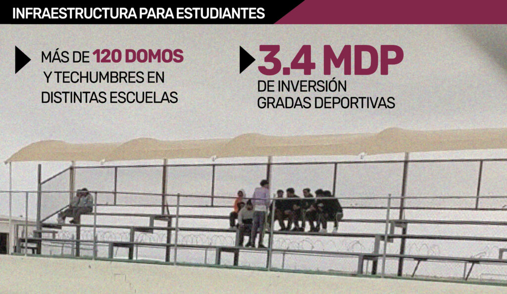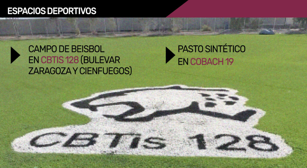 Además de los domos y aulas, el Municipio ha entregado infraestructura deportiva. Un ejemplo es la construcción de un campo de béisbol en el Cbtis 128, en bulevar Zaragoza y Camilo Cienfuegos, así como la instalación de pasto sintético en los campos de futbol del Cobach 19, cerca del Puente Libre.