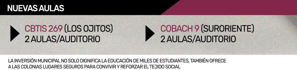 En la colonia Aeropuerto, la Primaria 18 de Marzo recibió una inversión superior a los 2 millones de pesos. En Tetos Car’s, la Primaria Guillermo Porras se transformó con otros 2.3 millones. Al suroriente, la Primaria Socorro Rivera y la Secundaria Técnica 41 también vieron mejoras por más de 3 millones en conjunto.