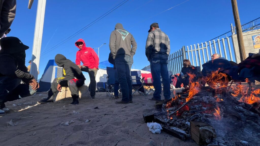 Junto a unas 50 personas, incluidas mujeres y niños, la mayoría con raíces anglosajonas, pero de nacionalidad mexicana, Berland tomaba calor alrededor de una fogata afuera del acceso al cruce Jerónimo-Santa Teresa esta mañana.