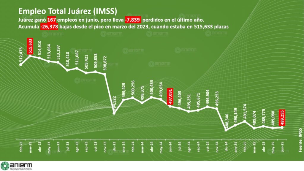 Juárez alcanzó el número más alto en marzo del 2023 con 515 mil empleos y ahorita ya vamos en 489 mil, es decir, hemos perdido más de 26 mil empleos en poco más de dos años, detalló Vázquez Tovar.