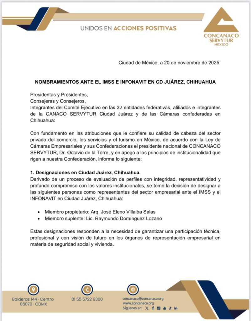 Los espacios que ocupaban Iván Pérez Ruiz y Rogelio Ramos Guevara en los consejos del IMSS y el Issste fueron retirados por la dirigencia nacional de Canaco, lo que generó inconformidad pública en junio debido a que Juárez quedaba sin representación en esos órganos donde se toman decisiones clave sobre inversiones, atención médica y asuntos laborales. Tras una nueva evaluación interna, la Confederación decidió asignar los escaños a Raymundo Domínguez Lozano y José Eleno Villalba Salas, para evitar que esos lugares se perdieran para la ciudad y garantizar continuidad en la voz empresarial juarense ante las instancias federales.