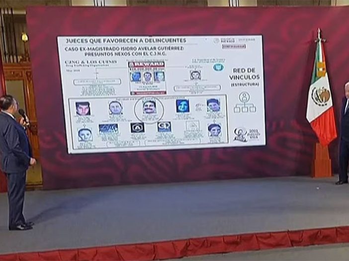El Departamento del Tesoro estadounidense señaló en 2019 a Avelar de favorecer a “Los Cuinis”, agregó Rodríguez Bucio al mostrar una red en la que presuntamente colaboraba el exmagistrado.