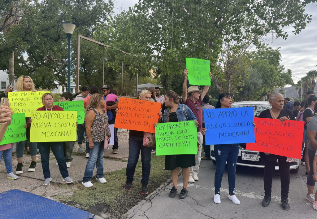 Entre las pancartas se puede leer “Soy madre de familia, exijo los libros de texto gratuitos”, “Yo apoyo la nueva escuela mexicana”, “ 190 millones de pesos en copias”.