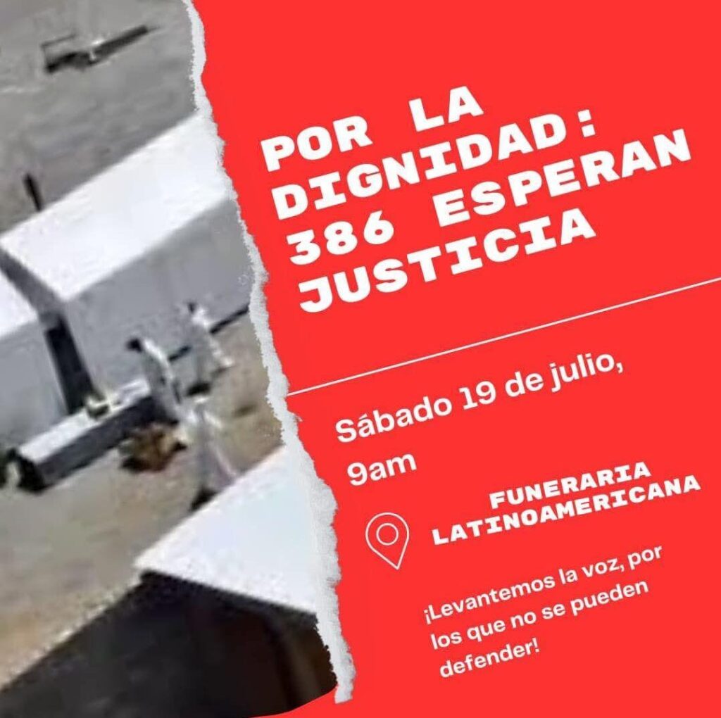 Con el propósito de que se haga justicia para las familias de los 386 cuerpos encontrados el pasado 28 de junio en el crematorio Plenitud, se dio a conocer que para el próximo fin de semana, están organizando una protesta en las afueras de la funeraria Latino Americana.