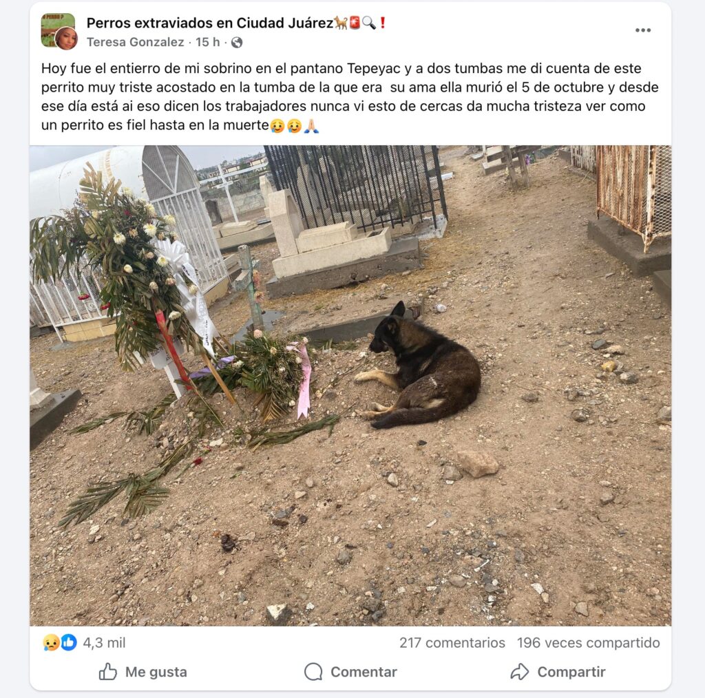 “Da mucha tristeza ver cómo un perrito es fiel hasta en la muerte”, escribió Teresa González, quien asistió al entierro de un familiar y se topó con la imagen del animal, solo, en medio del panteón.