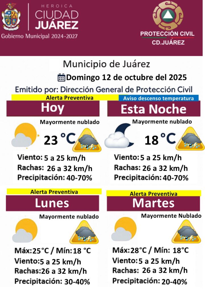 La dirección de Protección Civil del Municipio emitió un comunicado esta mañana, advirtiendo a la ciudadanía sobre posibles precipitaciones durante el domingo, lunes y aproximadamente hasta las 6 de la mañana del martes.