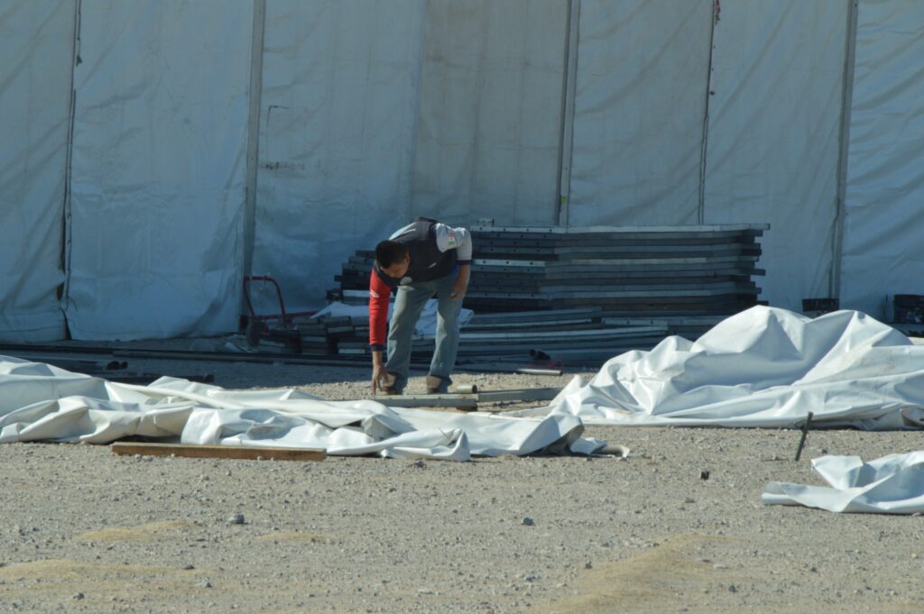 Sin fuertes vientos y ante un cielo totalmente despejado, decenas de trabajadores se encontraban realizando la reconstrucción de las carpas del Centro de Atención a Migrantes, instalado en El Punto, luego de los estragos que los fuertes vientos provocaron durante este jueves.