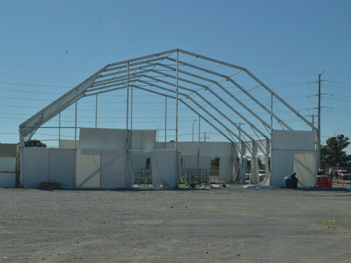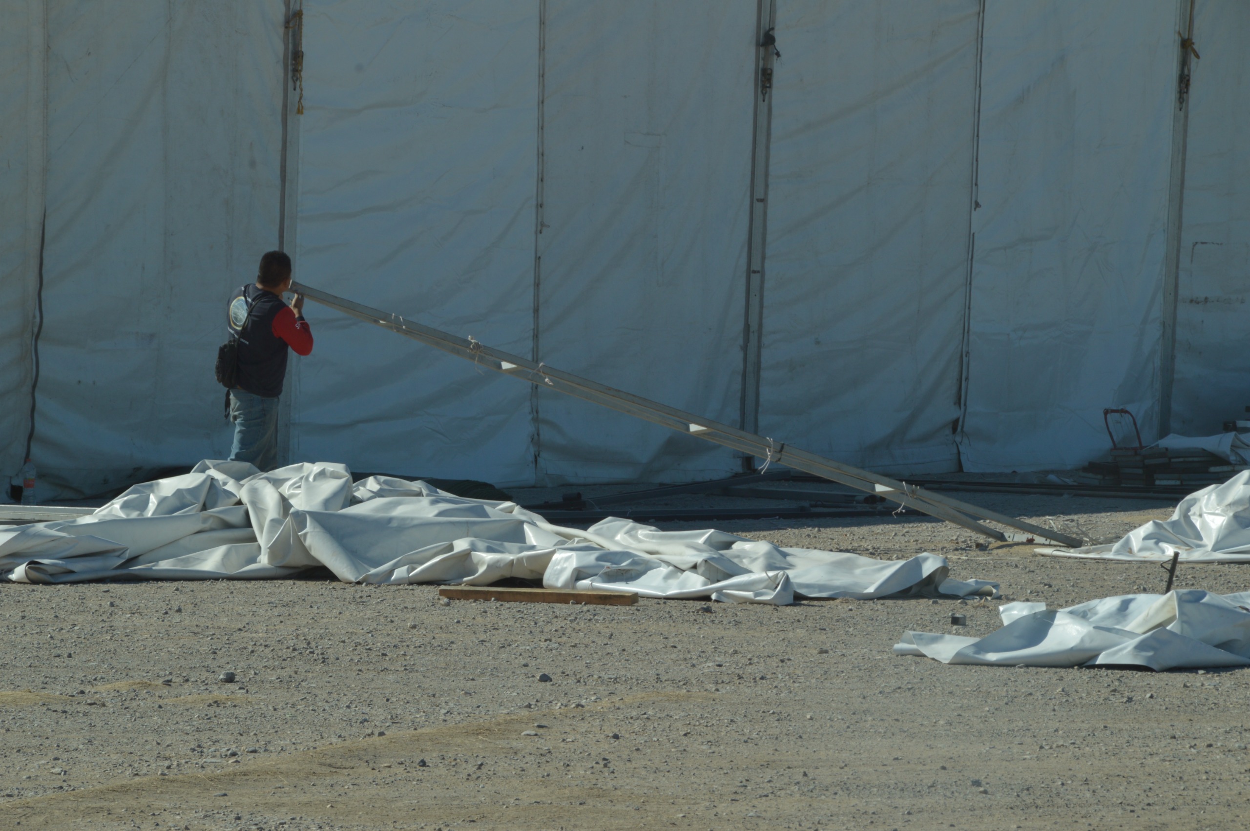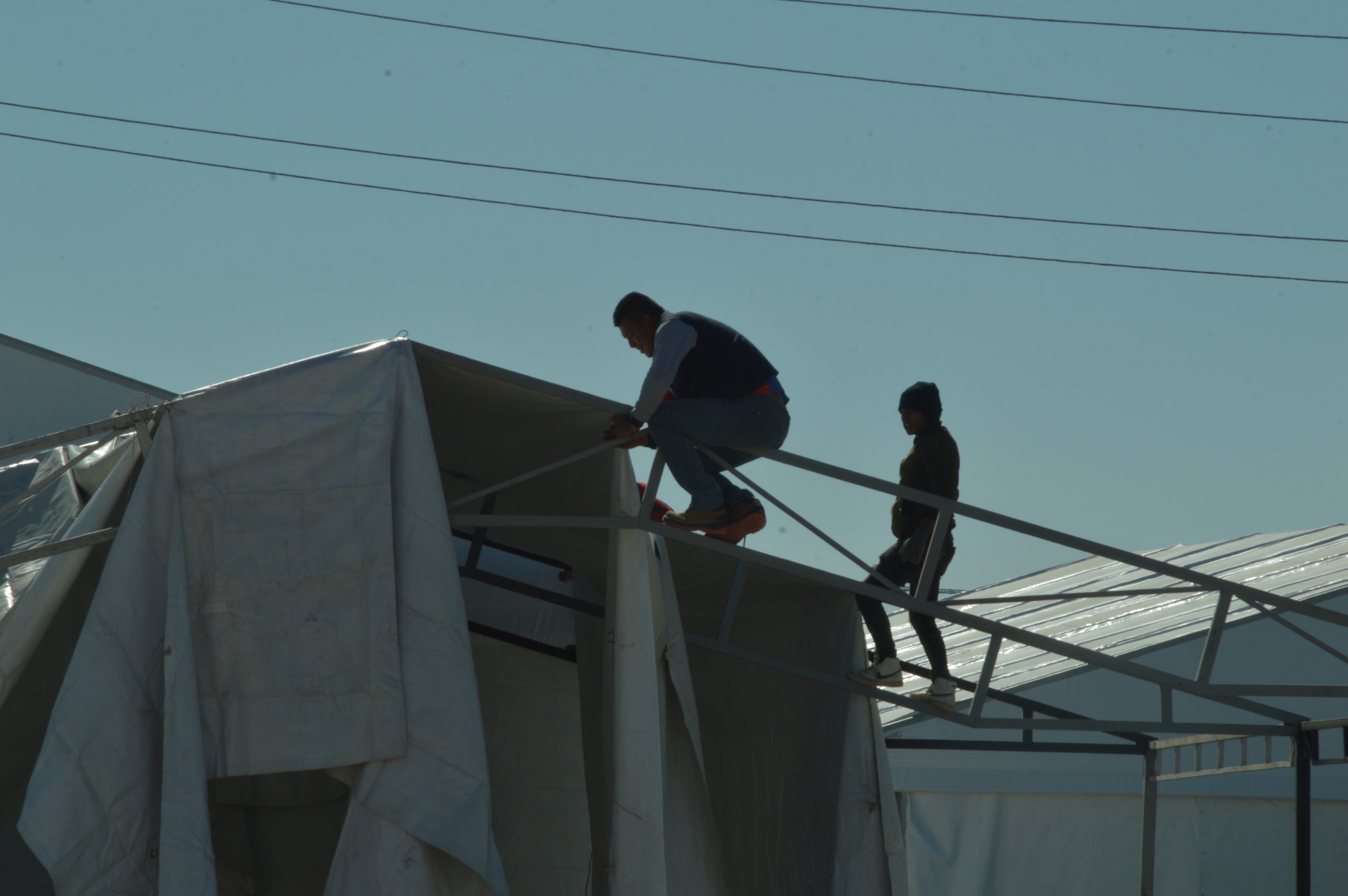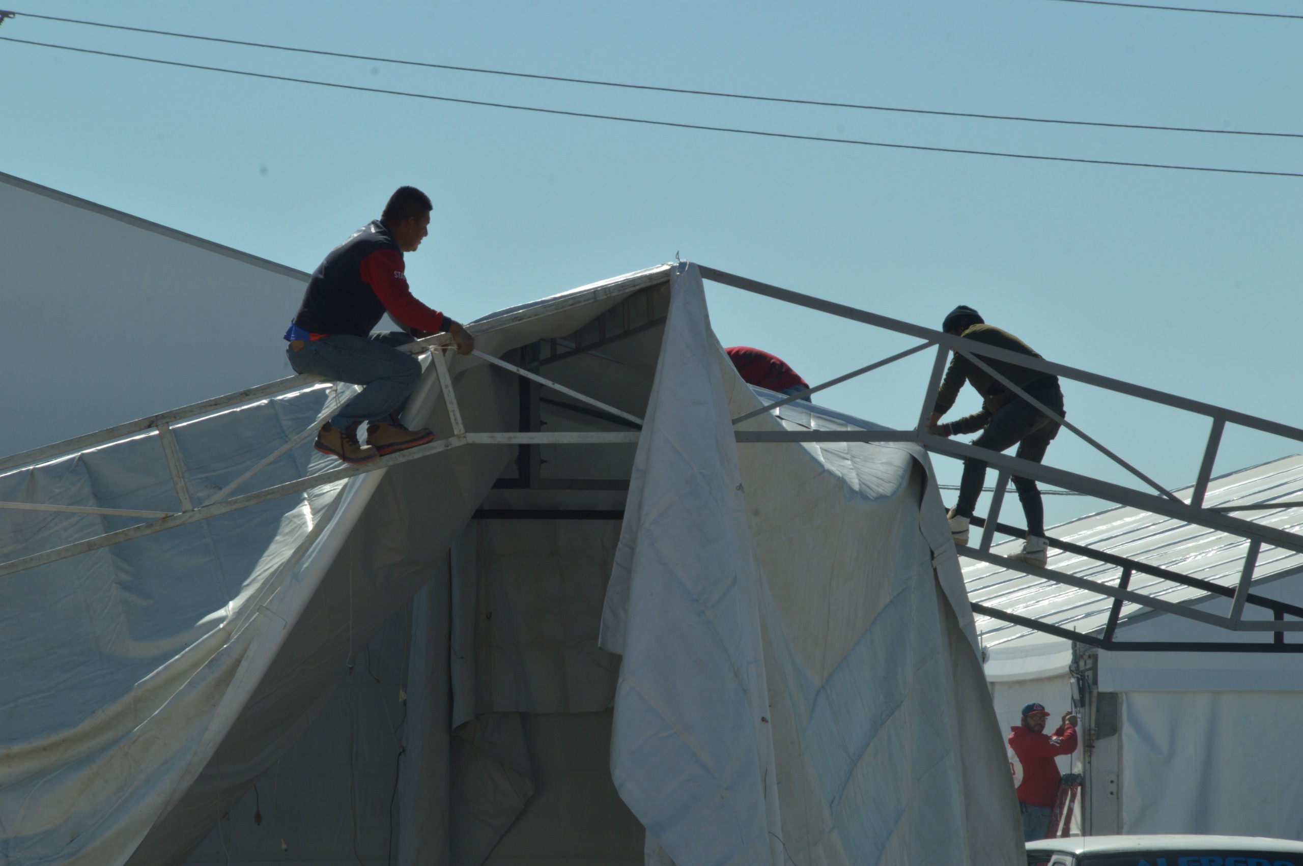 Sin fuertes vientos y ante un cielo totalmente despejado, decenas de trabajadores se encontraban realizando la reconstrucción de las carpas del Centro de Atención a Migrantes, instalado en El Punto, luego de los estragos que los fuertes vientos provocaron durante este jueves.